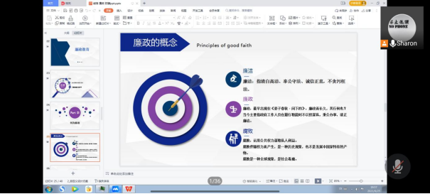 为践行社会主义核心价值观,引导同学们共建诚信自律的学风,加强新生的安全防范意识,21级辅导员邓拓老师于9月25日晚20:00通过腾讯会议开展了以“诚信·廉政·防骗”为主题的21级新生线上班会。此次班会分为“弘扬诚信美德、思考廉政建设、提高防骗意识”三个模块。会议别开生面,收效良好。