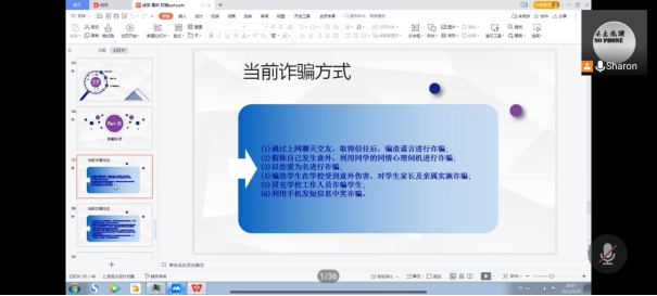 为了提高新生安全防范意识,预防校园诈骗情况的发生,邓拓老师重点讲解了第三模块“防骗”主题的内容。通过列举常见的诈骗方式,强调易被诈骗对象的特点,引导同学们树立防骗意识,提高警惕。对此,邓拓老师强调:“在日常生活中,要做到不贪图便宜、不谋取私利、不能轻信花言巧语。”此外,为切实保护学生免受财产及人身侵害,邓拓老师结合同学们的实际情况,教给同学们有效的防骗措施。希望通过这次主题班会的教育,能够提高同学们的防诈骗意识,增强同学们的自我保护能力。