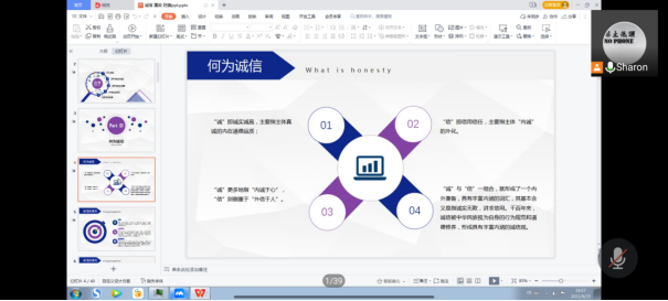 会议初始,邓拓老师就“诚信”话题,与同学们理性探讨“何为诚信?”。接着,同学们通过学习诚信主题的格言和故事,在伟人的身上汲取诚信的力量。最后,结合社会生活的实际,邓拓老师以一首朗朗上口的诚实守信诗告诫同学们:“承诺一定讲原则,培养诚实好品质。平等公平去竞争,争做文明大学生。”并呼吁同学们弘扬诚信美德,共建诚信自律的学风。