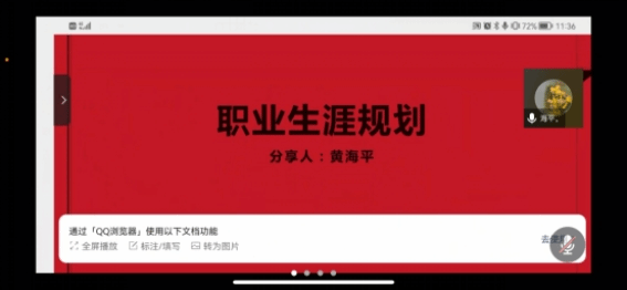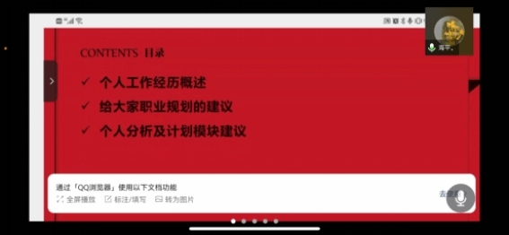 黄海平分享的主题是“职业生涯规划”,从个人工作经验入手,围绕职业规划建议、个人年度回顾及未来目标计划三个方面详细阐述如何合理规划自己的职业生涯。她分享了自己的求职经验和对自己所从事工作的认知,分析不同岗位的能力要求的差异,对同学们找准职业方向给出了切实可行的指导建议。她还结合了个人的亲身经历,提醒同学们不要待在舒适圈里停滞不前,要勇于接受挑战不断精进,从错误中总结经验,努力提升自身的专业技能水平。