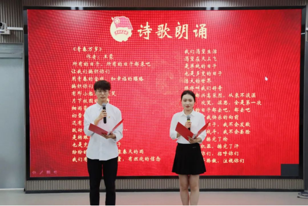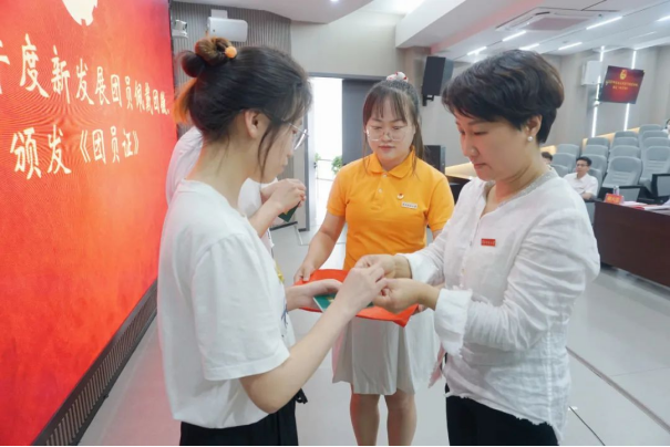 随后,举行了2021年新发展团员入团仪式。方琼为全体新团员佩戴团徽并颁发《团员证》。7名新团员在邓拓带领下,面向团旗庄严宣誓。