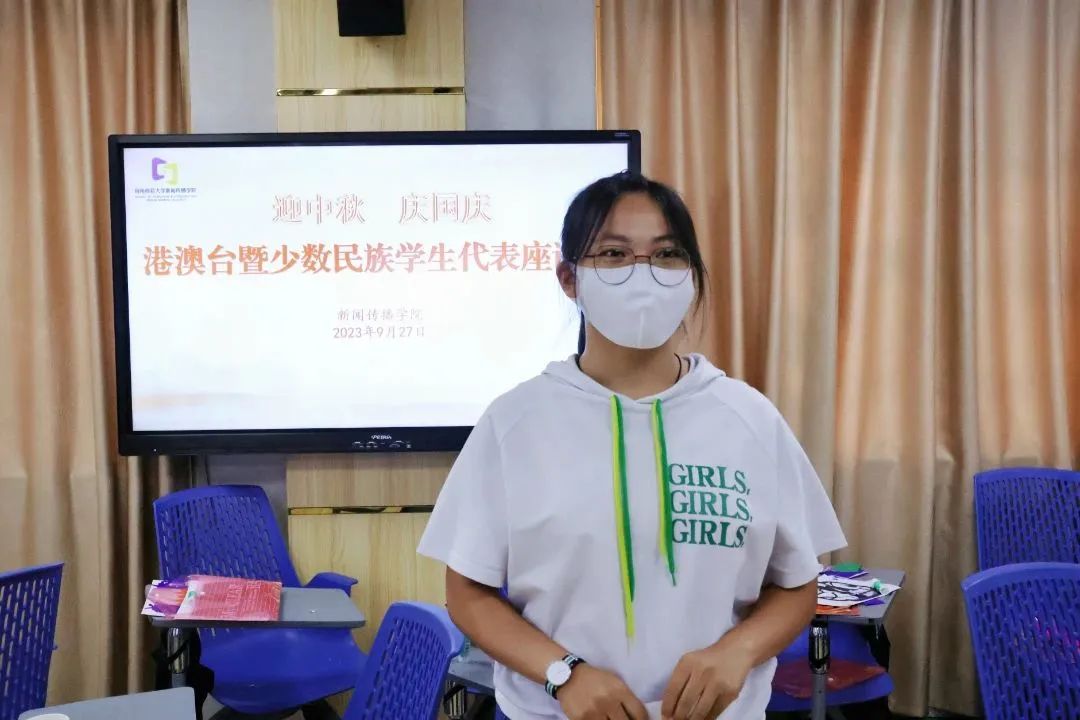 座谈会上,同学们品尝着代表民族团结精神的石榴,分享着金秋的柚子。座谈会在欢乐祥和、喜庆团圆的气氛中进行。苗族同学吴东花分享到,她的家乡在中秋节有“跳月”的风俗,以此寻找心上人,祈求婚姻幸福美满。来自中国台湾的纪筱琪分享到,她的家乡在中秋节的时候会吃月饼和吃柚子,家族会聚在一起烤肉。这起源于一句“一家烤肉万家香”的广告词,一句无心插柳柳成荫的小误会,成为中秋过节的小习惯。藏族同学格松次仁分享到,中秋佳节家乡有“寻月”风俗,沿着河流,跟着倒映水中的明月,把月影赏遍,然后回家团圆吃月饼。