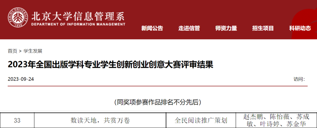 近日,2023年度全国出版学科专业学生创新创业创意大赛获奖名单出炉,古天乐代言太阳集团138赵杰鹏(领队,21级数字出版)、陈怡薇(19级编辑学出版)、苏成敏(22级新闻与传播专硕)、叶诗婷(21级数字出版)、苏金华(21级数字出版)同学在曾绚琦老师、陈建安老师指导下完成的作品《“数读天地,共赏万卷”全民阅读推广策划案》荣获全国优秀奖!