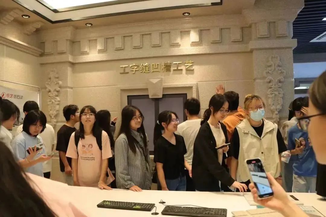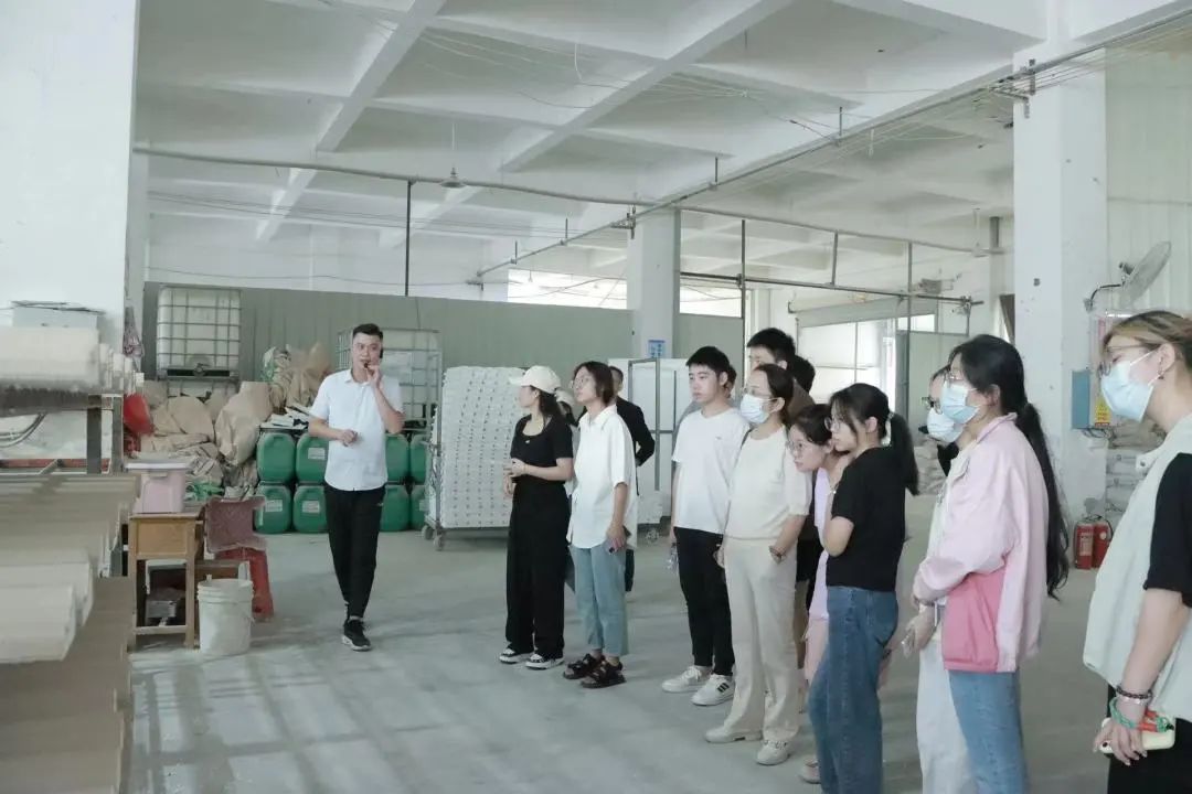 师生首先参观了解了统艺仿石漆外立面系统施工工艺、磨边打胶工艺等制作工艺及其成品样板。在亲手触摸与感受中,深入对统艺仿石漆的了解。接着,实践队进入了EPS生产车间、雕花车间进行参观。了解统艺仿石漆的制作工序、步骤以及园区产业规模等内容。