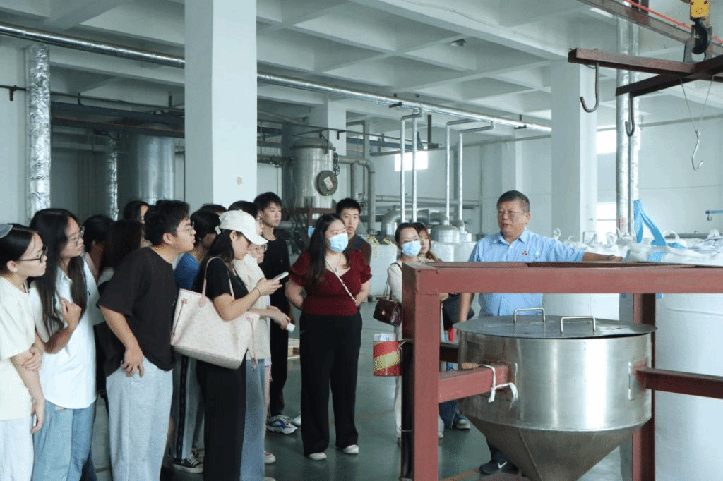 学院师生首先前往泉州市鲤城区,来到了福建省鸿福化纤实业有限公司。在厂长张进兴的带领下,同学们依次进入纺丝工艺制作各车间,了解投料操作、油剂调配等工艺流程。