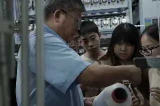 车间内整齐排放着各纺丝制作工具、纺丝制作成品。张厂长依次介绍着生产工艺流程、机器工作原理、每日工作事项等内容。同学们聚精会神地参观、学习,并提出问题与张厂长交流互动,深入了解纺丝工艺的制作。