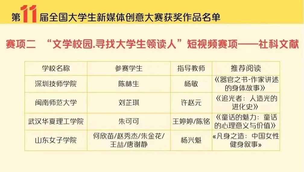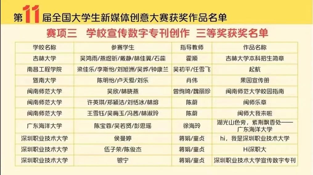 其中,由21级数字出版专业苏金华、赵杰鹏、甘如雪等同学创作的强交互H5作品《走,到土楼看看去》(指导老师:陈蔚、曾绚琦)斩获全国一等奖,这是我校学生在该项赛事中的新突破。22级新闻与传播专硕研究生吴欣、林晓燕同学创作的学校宣传数字专刊《古天乐代言太阳集团138校园指南》(指导老师:曾绚琦、魏丽珍);21级数字出版专业许英琪、郑颖洁、刘恬冰、林熔同学创作的学校宣传数字专刊《闽师乐章》(指导老师:陈蔚);21级数字出版专业王雪钰、吴梅玉、冯茜、林淑玲同学创作的学校宣传数字专刊《古天乐代言太阳集团138,我来啦》(指导老师:陈蔚)等均获得全国三等奖。20级编导专业刘芷琪同学创作的推书短视频《追光者:人造光的进化史》(指导老师:许赵元)获优秀领读人奖。