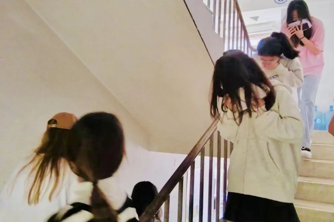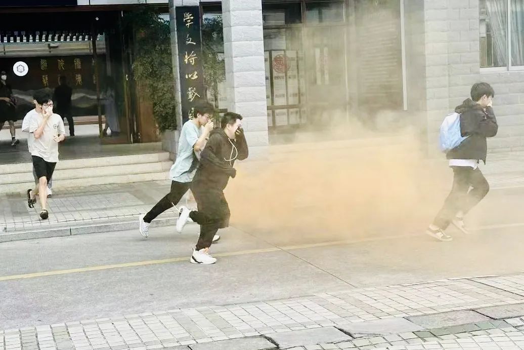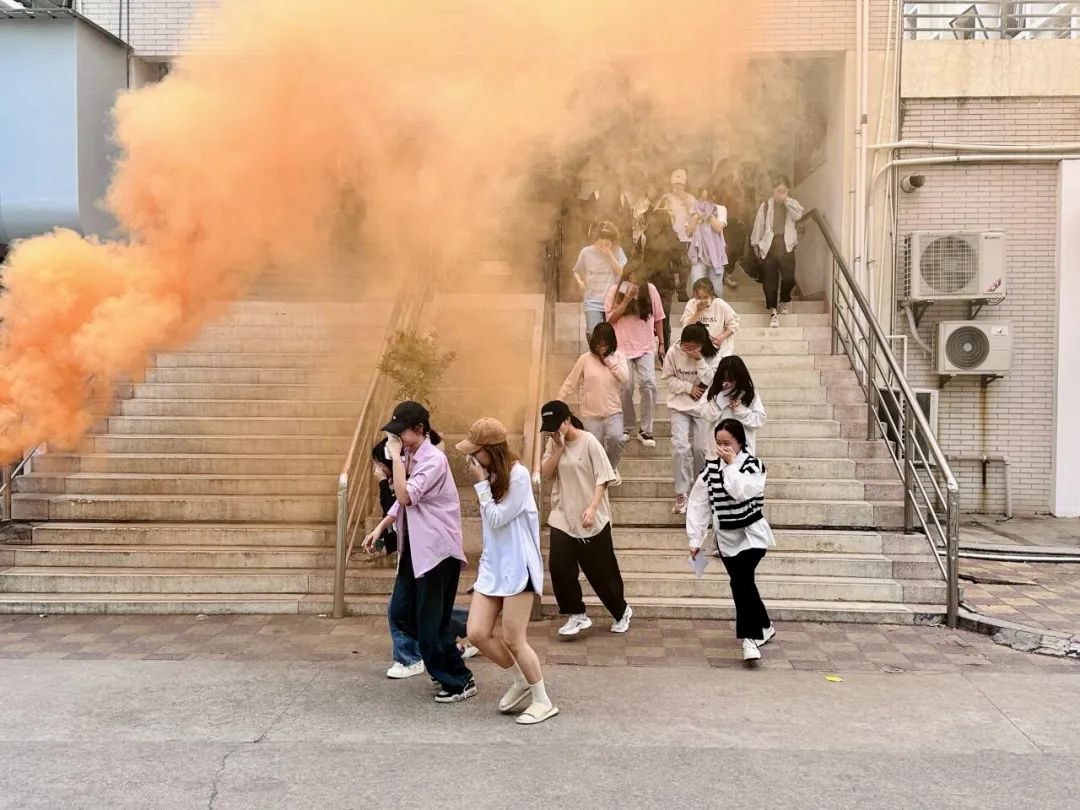 下午三点半整,学院各年级辅导员确认控场完毕、学生准备就绪,由演练总指挥下达演练开始命令,达理7号楼、8号楼负责点燃消防演习烟雾弹的人员接到命令后,通过对讲机向通讯联络组发出火警响铃,并释放消防烟雾。接到火警后,同学们以湿毛巾捂住口鼻,身体保持低位,有序跟随引导撤离到指定集合地点。