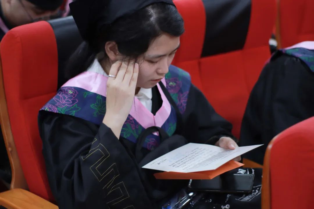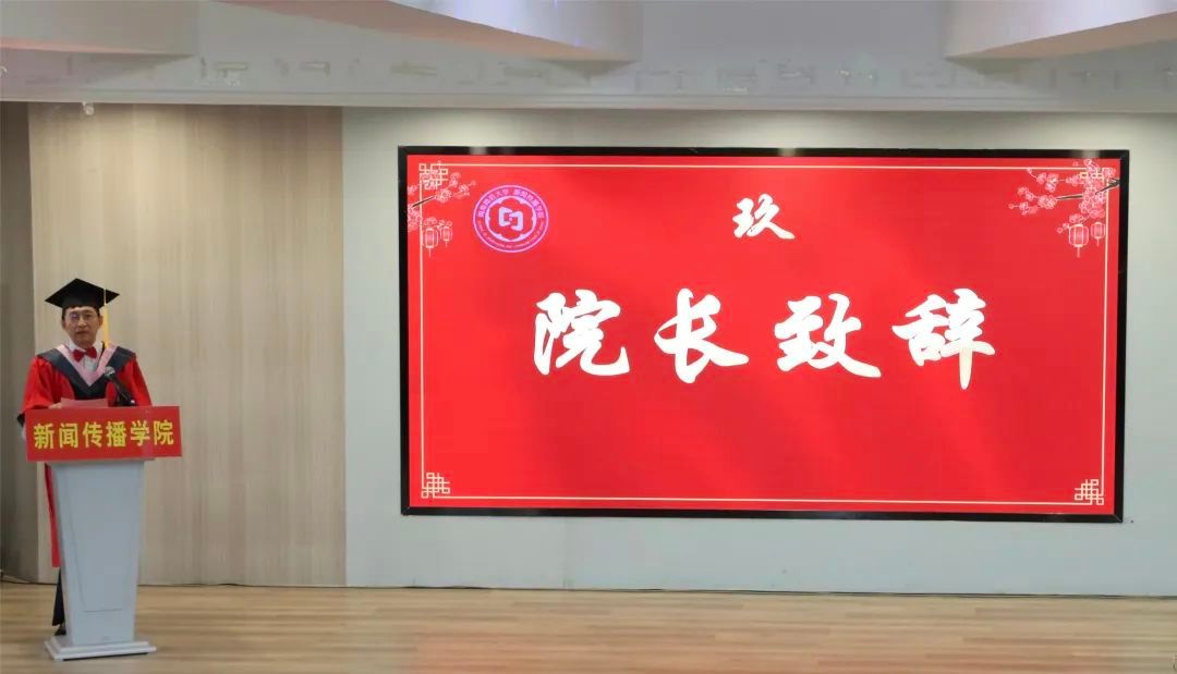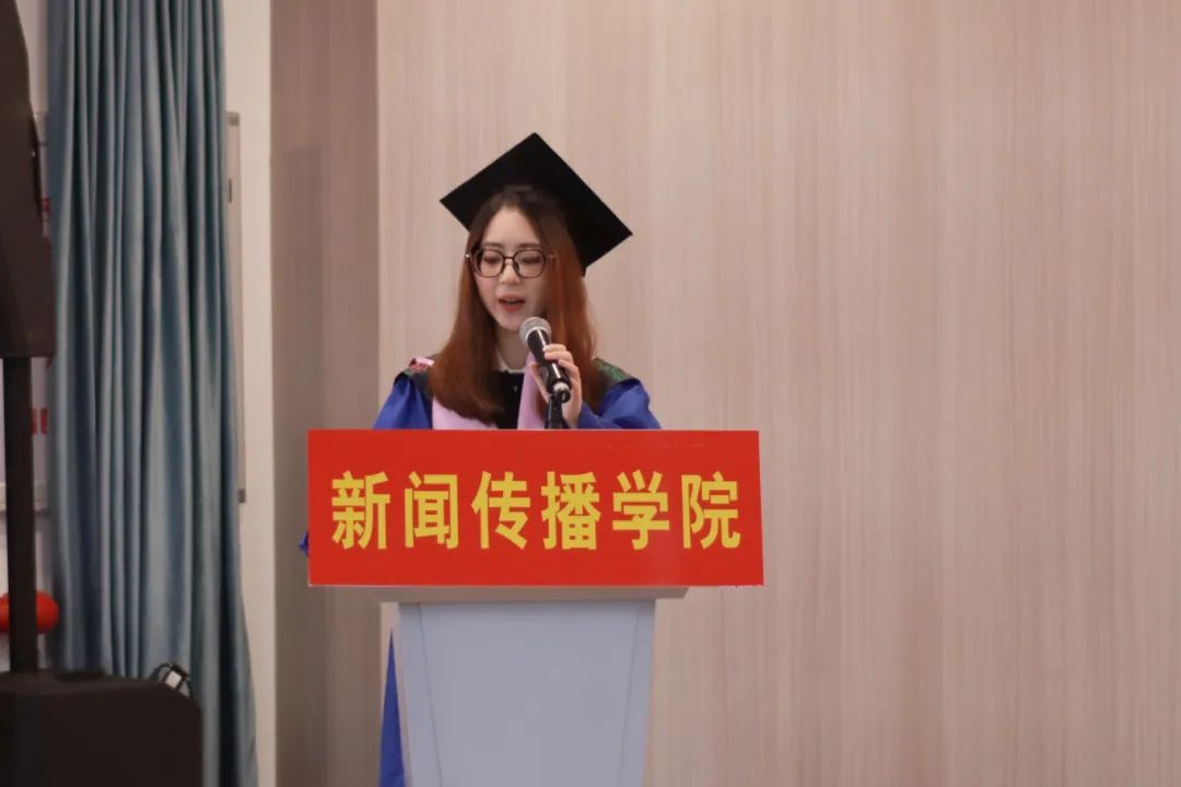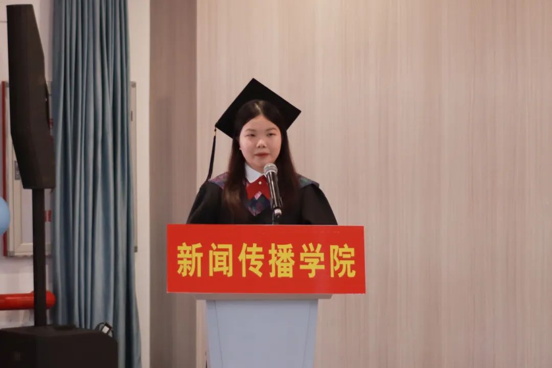 在这扬帆起航的崭新起点,学生代表上台发言。2024届本科毕业生代表陈瑜婷同学表达了对学校和默默付出的亲友的感谢,对老师的敬意,感谢他们的辛苦付出。硕士毕业生代表吴珊珊同学,表示她在新传院求学了7年,回顾这7年,学校和老师对她有着巨大的鼓励和帮助,虽然面临了许多困难,但正是这些困难,更让她明确了自己的目标。她们的发言充满了激情与自信,赢得了在场师生的热烈掌声。
