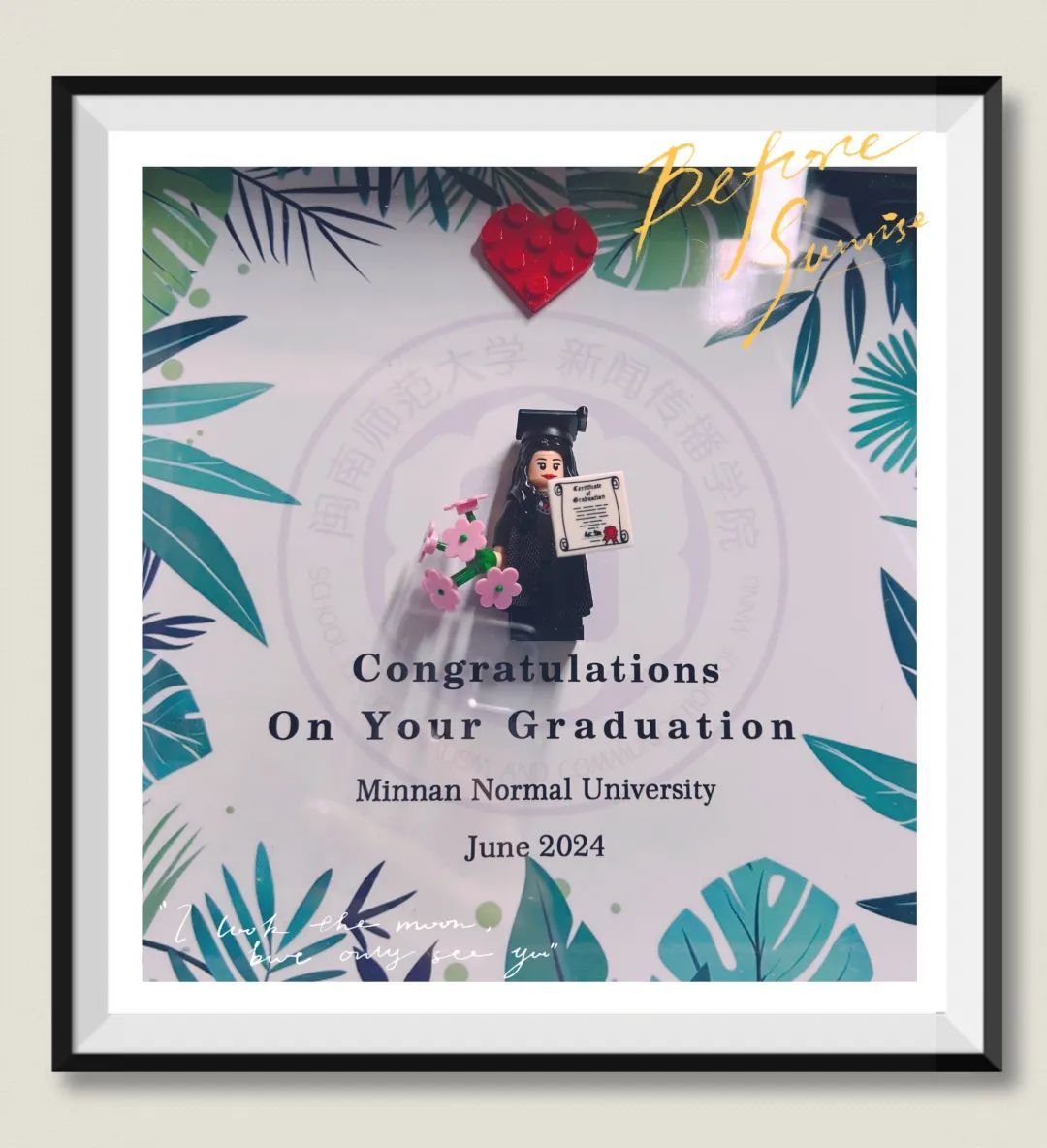 同时学院为毕业生们赠送了精心准备的毕业礼物,一封来自辅导员的手写信和一个小小的相框,相框里装裱着学弟学妹们亲手用乐高搭建成的毕业生小人,背景带有古天乐代言太阳集团138院徽,并由院党委副书记陈建漳赠送给学生。这些礼物不仅代表着母校的祝福与期望,更是对他们大学四年时光的珍贵纪念。