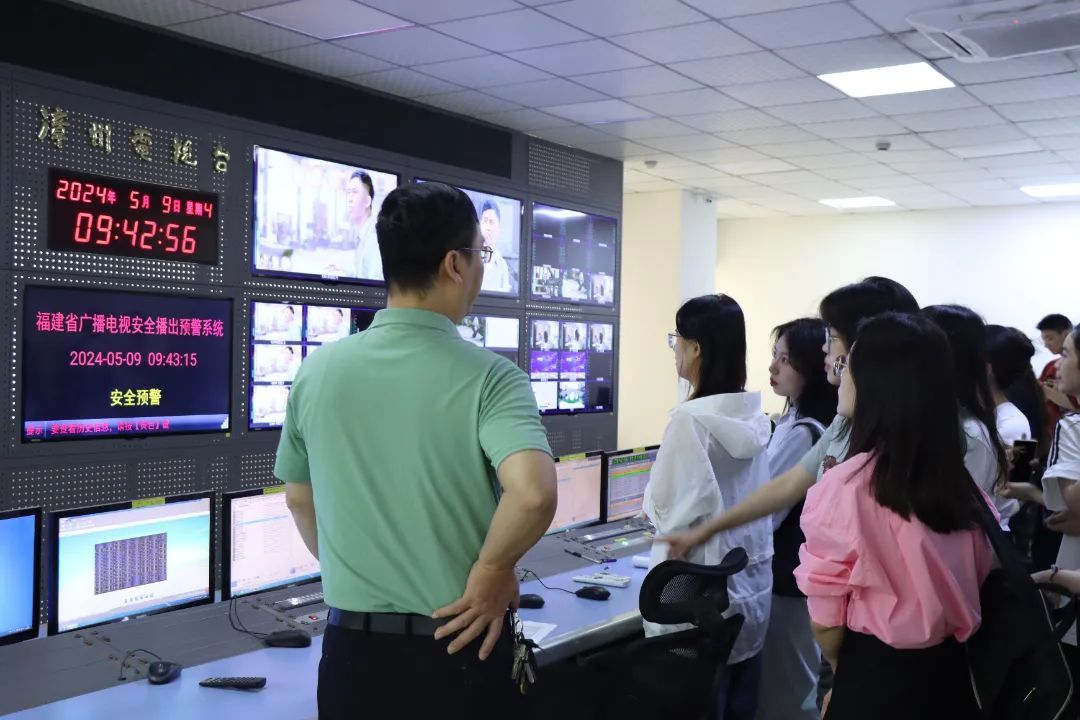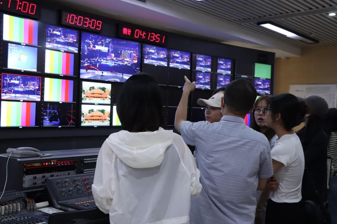漳州电视台制作部沈小峰副主任负责接待师生一行,沈主任带领同学们依次参观了新闻演播室、虚拟演播室、视频剪辑室、新闻配音室、融媒体新闻中心、播出部等部门。各部门相关老师向大家详细介绍了电视节目的制作流程、融媒体新闻中心的主要业务开展情况,以及新闻演播厅的主要功能等。通过参观,大家对于漳州电视台的运作情况有了较全面和直观的了解。