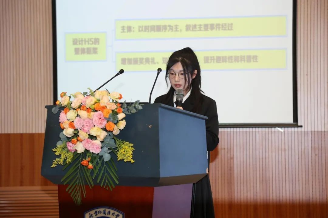 此次颁奖典礼还安排了优秀作品汇报环节,韬奋基金会原理事长聂震宁,中国编辑学会会长郝振省等专家领导莅临现场指导。H5作品《这一跪,将生命高高托起》团队获主办方邀请,在颁奖典礼现场分享作品创作心得。团队负责人方佳卉同学讲述了作品创作过程、收获和挑战。该作品获得了现场专家评委的一致好评,中国新闻技术工作者联合会副理事长兼秘书长宋海涛对作品进行了专业深入地点评,肯定了作品体现出的创作团队的专业素养。