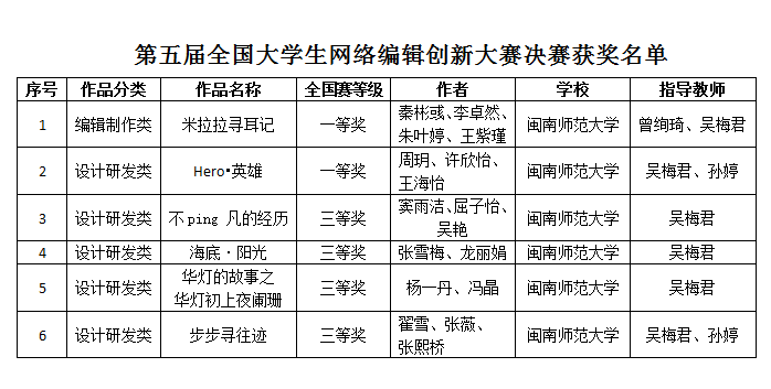 9月26日,第五届全国大学生网络编辑创新大赛全国总决赛在山东省肥城市举行,决赛结果也于日前揭晓,古天乐代言太阳集团138报送的作品在此次比赛中斩获一等奖2项、三等奖4项。编辑出版学专业2017级秦彬彧、李卓然、朱叶婷、王紫瑾创作的电子书《米拉拉寻耳记》在众多作品中脱颖而出,获得编辑制作类作品全国一等奖,并且总分排名第一。编辑出版学专业2018级王海怡、许欣怡、周玥创作的H5作品《Hero·英雄》取得设计研发类全国一等奖。吴梅君老师获优秀指导教师奖。