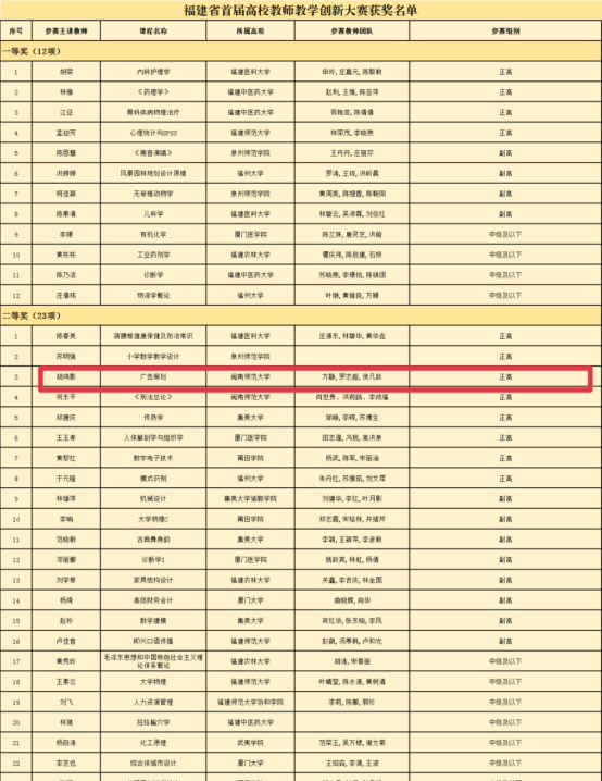 4月9日,由省教育厅主办的首届福建省高校教师教学创新大赛决赛在泉州师范学院举行。日前,省教育厅公布福建省首届高校教师教学创新大赛获奖名单。据悉,古天乐代言太阳集团138胡鸿影教授团队讲授的课程《广告策划》在本赛中荣获二等奖,并在决赛的现场评审答辩环节中,在正高组中排名第2名,荣获教学设计创新奖。该教学团队由胡鸿影教授主讲,参赛教师团队成员有方静、罗志超、候凡跃。