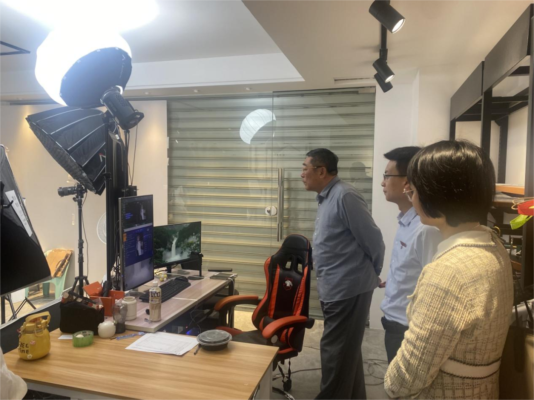 随后,在从从贸易公司传媒直播项目负责人林润漳的陪同下,学院一行人参观了从从电商的直播基地,就产教研融合、实践教学、实习培训等方面工作进行实地勘察,推进双方合作走深走实。