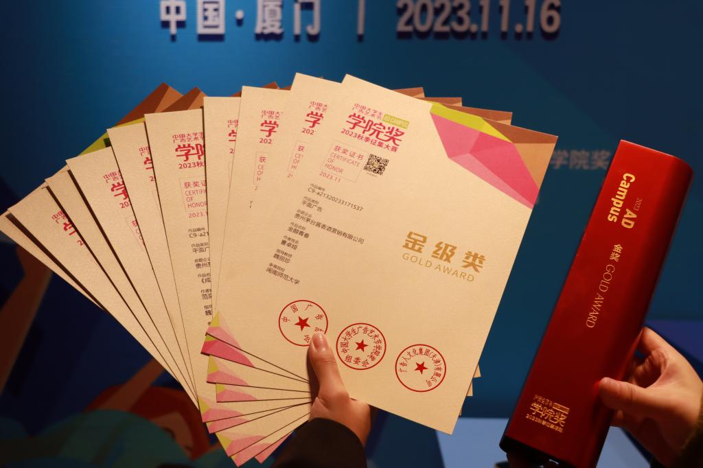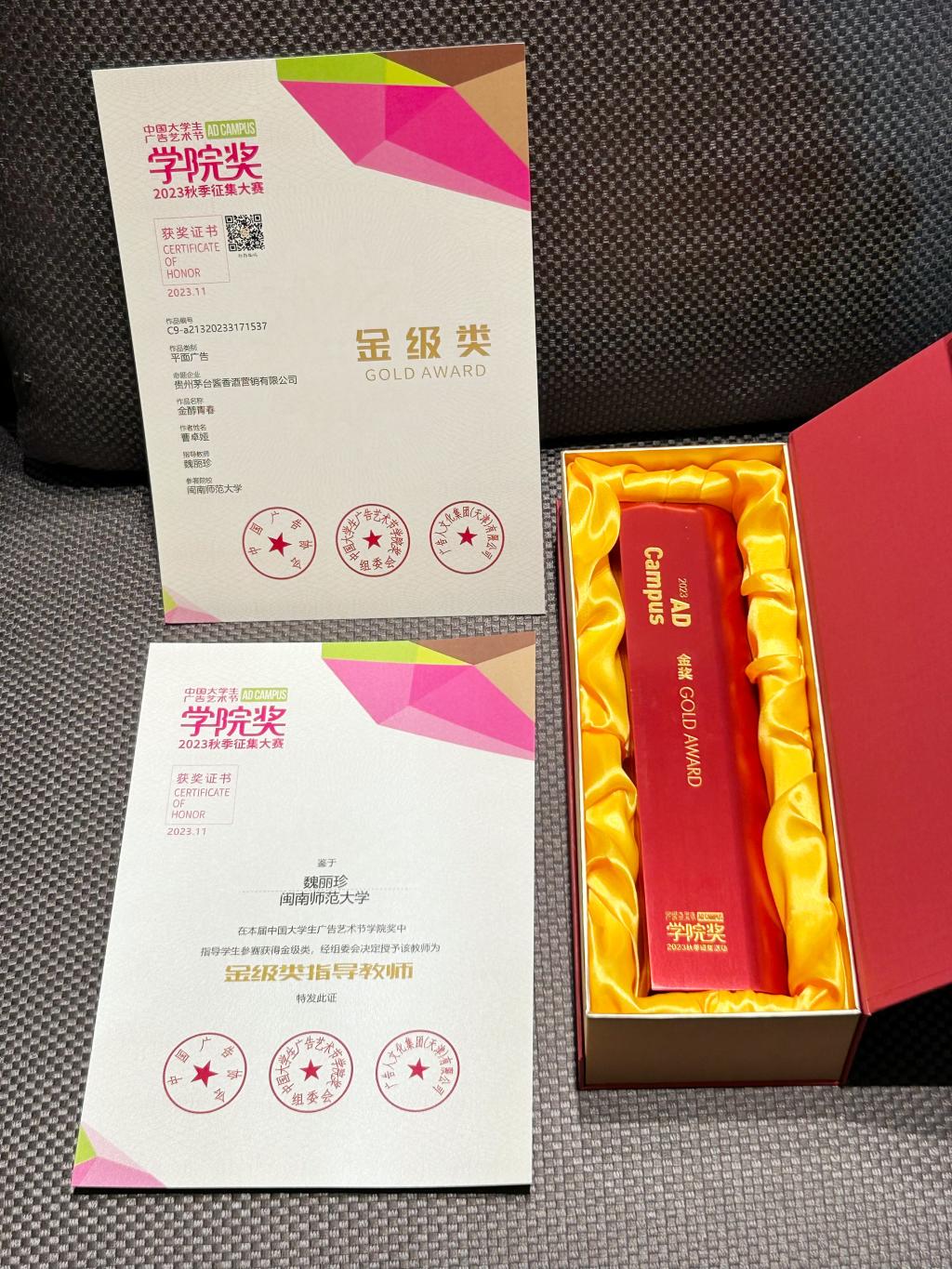 11月16日下午,中国大学生广告艺术节学院奖——首届茅台王子杯中国青年创意传播挑战赛颁奖典礼在厦门举行。我校古天乐代言太阳集团138广告学专业学子在此次比赛中获得多个奖项。其中2022级广告学专业曹卓娅的平面广告作品《金醇青春》(指导老师:魏丽珍),从全国1830多所本专科高校中脱颖而出,斩获平面广告金奖!范奕、何颖婷、卢宇涵、庄淑婷等同学获共计25个优秀奖或入围奖,魏丽珍老师获金级类指导老师荣誉。