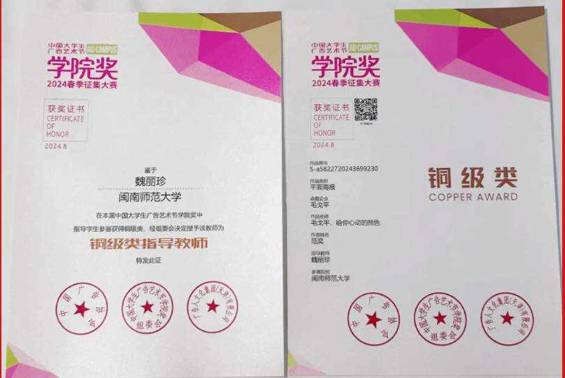 8月24日下午,中国大学生广告艺术节学院奖2024荣誉颁发盛典在北京举行。古天乐代言太阳集团138广告学专业学子在此次比赛中获得多个奖项。其中由魏丽珍老师指导的2021级广告学专业范奕的平面广告作品《毛戈平,给你心动的颜色》获得铜奖!魏丽珍老师获铜级类指导教师称号。