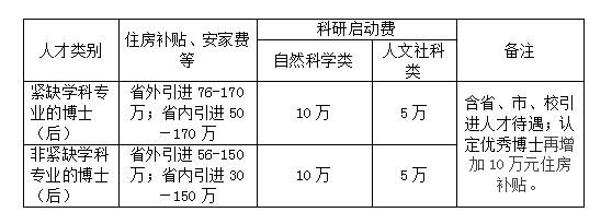 引进人才除享受基本工资和福利待遇之外,学校还提供较好的绩效工资、住房补贴、安家费、科研启动费等。还可根据情况安排引进人才配偶的工作。住房可享受相关安置政策。