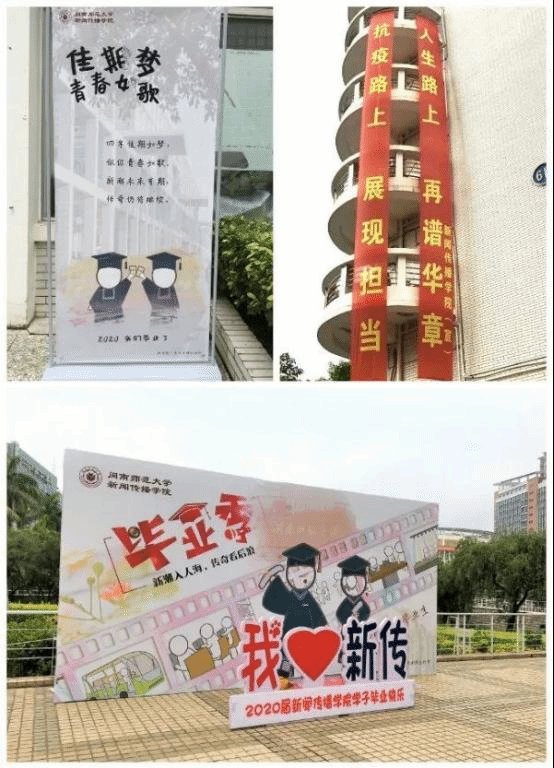 学院在钻石广场、宿舍区、教学区等地挂上了横幅,贴上了海报,为毕业生们营造一个温馨热闹的返校氛围。