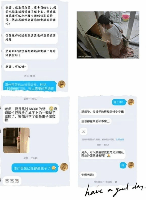 古有千里烽火书信遥寄,今有远程“云投”导员心系。聊天软件响个不停,“林老师,这该怎么办呀?我和家里发生了...”“老师,笔记本、相机都落在学校了。心疼设备!”“老师,毕业的相关材料如何交接啊,好绝望。”“导员!我宿舍里恐怕要处理一下过期食品,能帮我一下吗?”