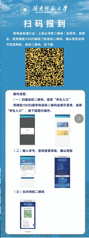 ★在南大门,需核验“返校通行证”→扫“返校二维码”,生成“到校二维码” →体温检测→卫生消毒,符合条件者方可入校。