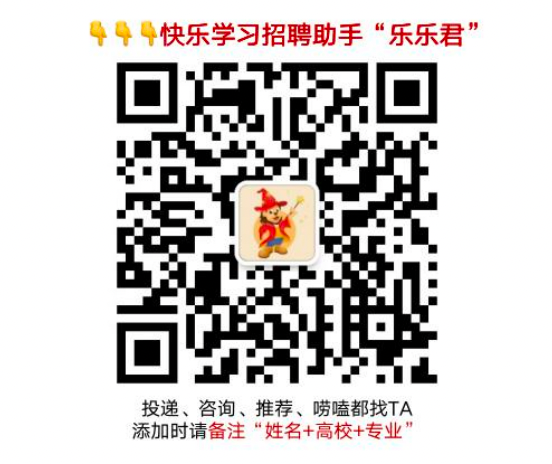 扫下方码添加快乐学习招聘助手“乐乐君”,可投递、可咨询、可推荐、可唠嗑~