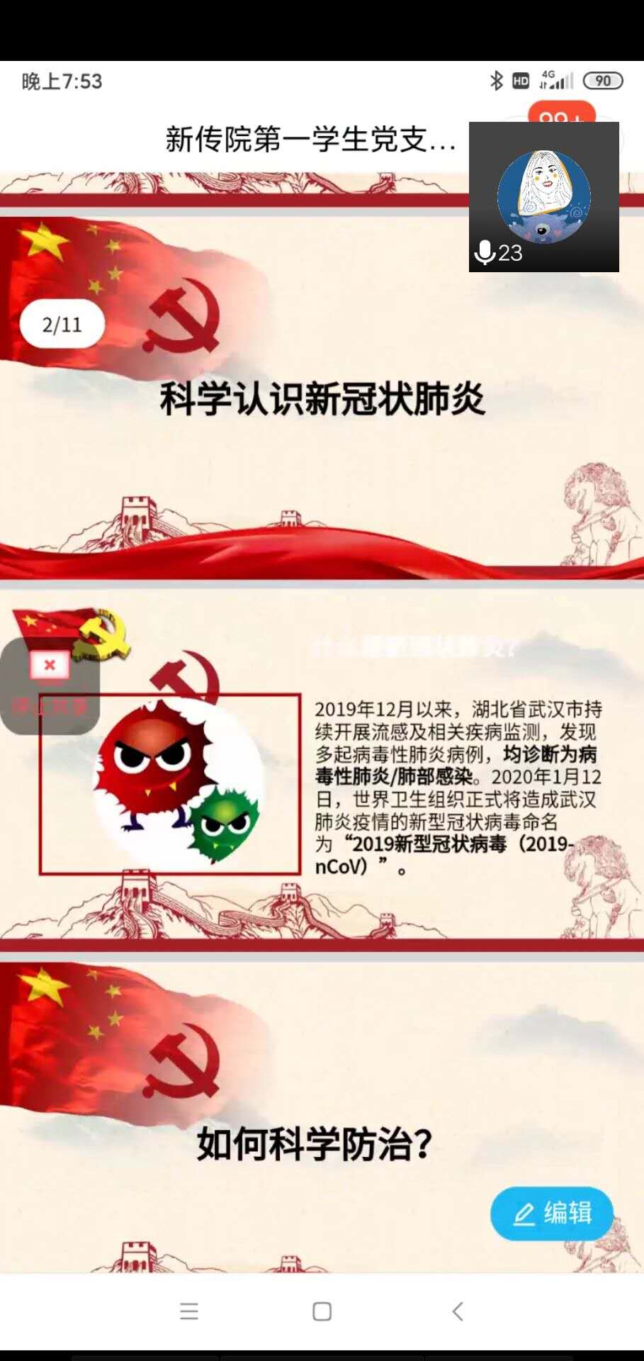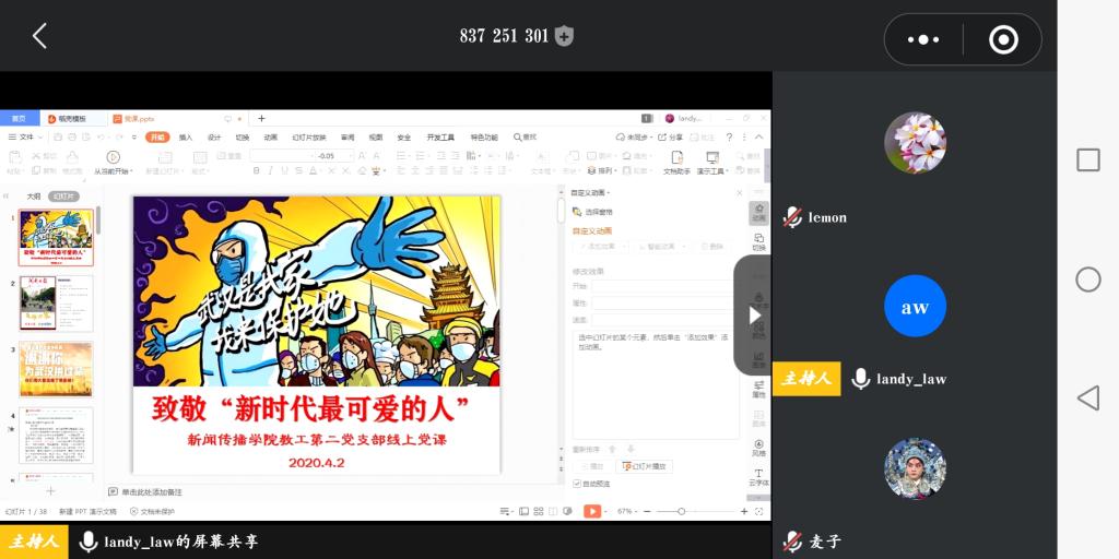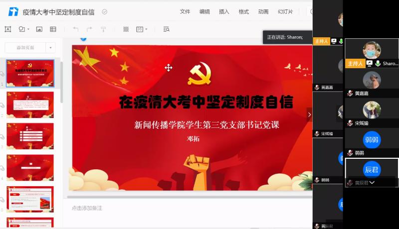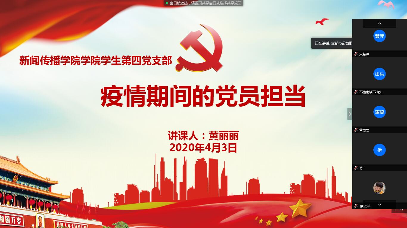 新冠肺炎疫情牵动着举国人民的心,中国人民坚定信心,同舟共济,众志成城,科学防治,目前取得了疫情防控的阶段性胜利。为让学生党员对新冠肺炎有全面的认识,科学的防控,更好发挥党员先锋模范作用,4月3日晚,学生第一党支部通过“腾讯会议”开展了“面对战"疫",党员何以作为”的线上党课。支部书记李福华从科学认识新冠肺炎、如何科学防治、如何发挥党员在疫情大考中的作用等几个方面进行讲述,并表示在两个多月里,学生党员在思想上行动上始终与党中央高度保持一致,积极响应学校党委对疫情防控的要求,正确认识,冷静对待,科学防控;不造谣、不信谣、不传谣,全面了解疫情的相关信息,尽力向身边的社区群众做好宣传普及工作,并积极响应基层党组织的号召,主动到社区当志愿者,做宣传员,守门员。同时,支部党员积极发挥新闻人的优势,积极创作抗疫作品,传播抗击疫情的正能量,营造同舟共济、众志成城、共克时艰的良好氛围。