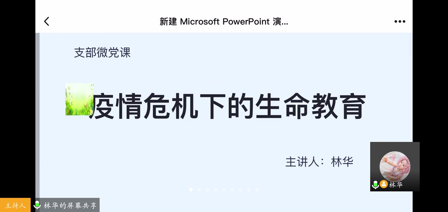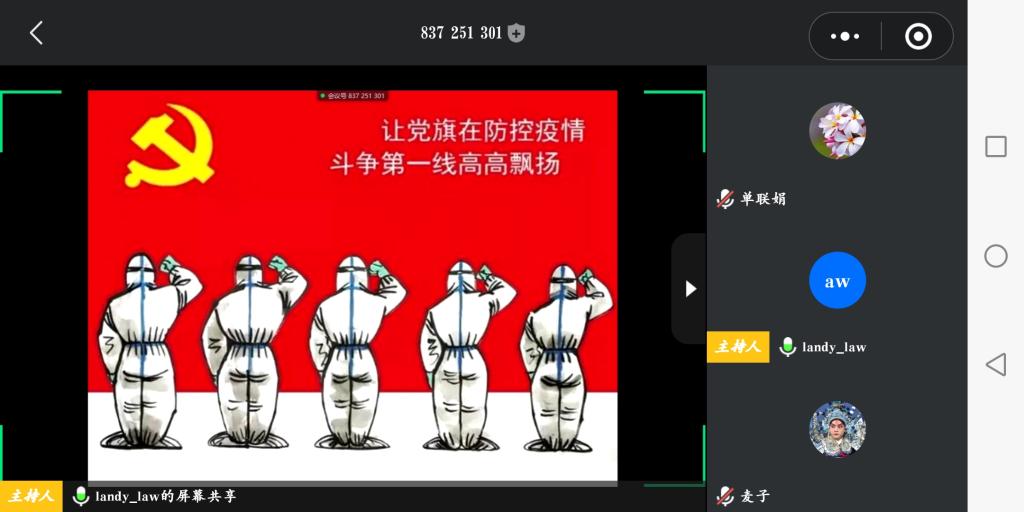 为了推动党支部党员在疫情防控期间的学习教育不断线、不断档、不冷场,提高党员认识,坚定信念,更好的发挥党员先锋带头作用。近期,学生第二党支部以“腾讯会议”为载体,组织全体党员开展以“疫情危机下的生命教育”为主题的党课活动。支部书记林华首先带领大家回顾了疫情期间全国人民同舟共济抗击疫情的过程,阐述了在面临新冠疫情重大突发事件时,中华民族展现出了强大的凝聚力、向心力和战斗力。接着,围绕尊重自然、敬畏生命,身在家中、心向世界,直面人性、审视自我和致敬英雄、牢记担当四个部分展开。面对疫情,她强调要敬畏生命,尊重大自然,与自然和谐共存;面对疫情,要坚定信心、同舟共济、科学防治、精准施策;面对疫情,要重新思考生命的意义。最后,她倡导支部党员要有担当、有作为,按照学校和学院的防疫工作要求,扎实投身到疫情防控工作中去,用实际行动践行党的初心和使命,共同战“疫”。