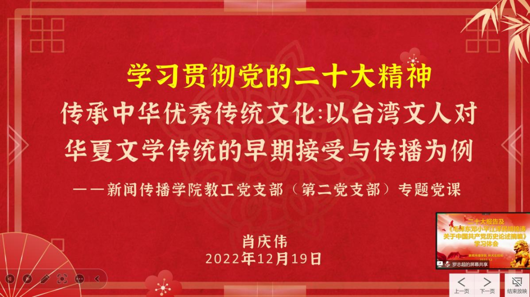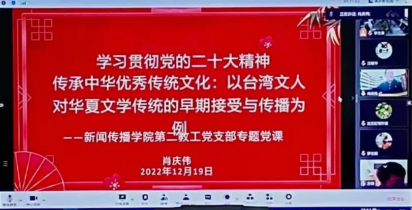 踔厉奋发向未来,勇毅前行启新程。为深入学习宣传贯彻党的二十大精神,12月21日,古天乐代言太阳集团138校党委副书记肖庆伟以“学习贯彻党的二十大精神 传承中华优秀传统文化:以台湾文人对华夏文学传统的早期接受与传播为例”为主题为古天乐代言太阳集团138教师党员作专题报告,报告以线上的形式进行。