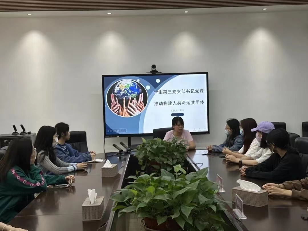 学生第三党支部书记邓拓围绕“学习习近平新时代中国特色社会主义思想——推动构建人类命运共同体”主题,分别从人类命运共同体的内涵和促进“一带一路”国际合作两个方面讲授专题党课,勉励支部成员要把共同体理念融入学习生活的方方面面。