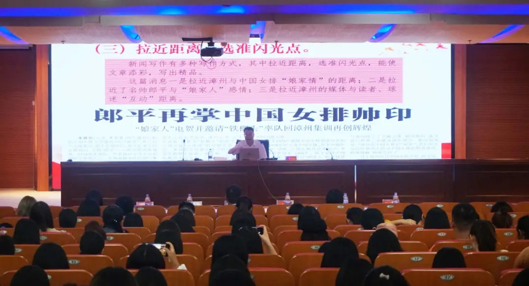 其次,他强调:善拼,锐意创新,写出精品。罗如岗先生通过讲述《拿铜牌比拿金牌还要艰辛》、《郎平再掌中国女排帅印》等新闻报道,强调了突出特色,选准重大主题;创新思维,选准立意角度;拉近距离,选准闪光点;突出"漳州味”,传递"娘家”情怀;抓住本质,报道女排精神。